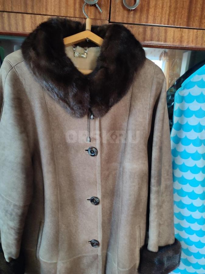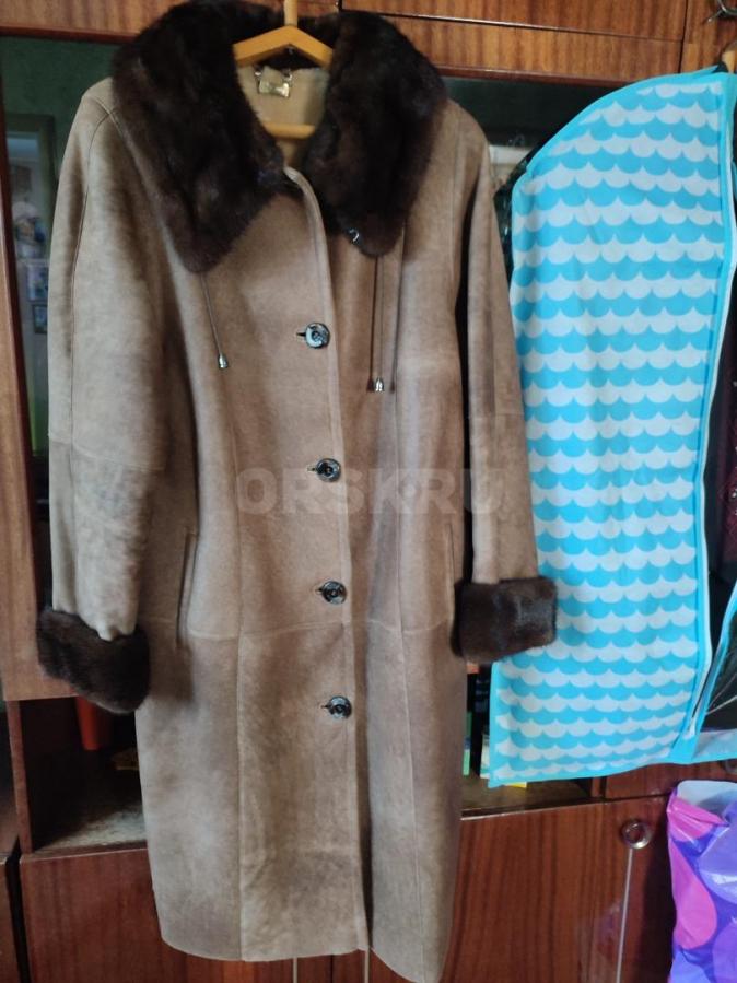 Продам дублёнку женскую натуральную. Воротник и отвороты рукавов выполнены из норки коричневого цвета. Дублёнка без потёртостей, пятен, чистая, состояние хорошее. Размер 50-52.