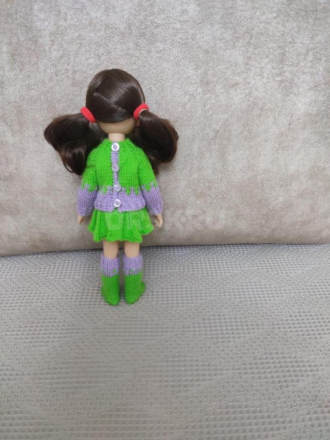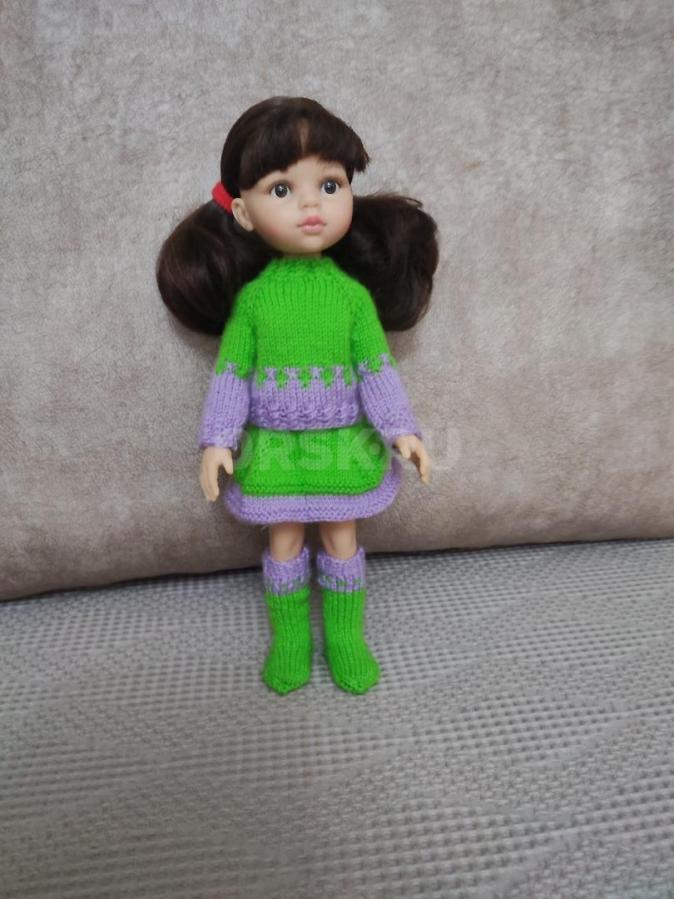 Продам вязаный комплект одежды на куклу Паола Рейна ростом 32 см. Комплект состоит из джемпера, юбки и гольф, связанных из мягкой и уютной шерстяной пряжи. Все элементы одежды легко снимаются и надеваются, что удобно при игре с куклой.