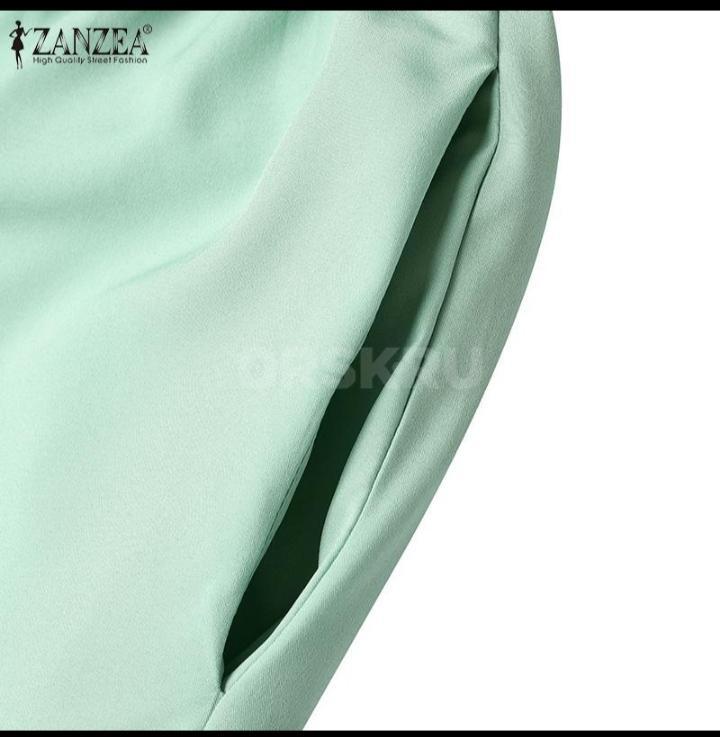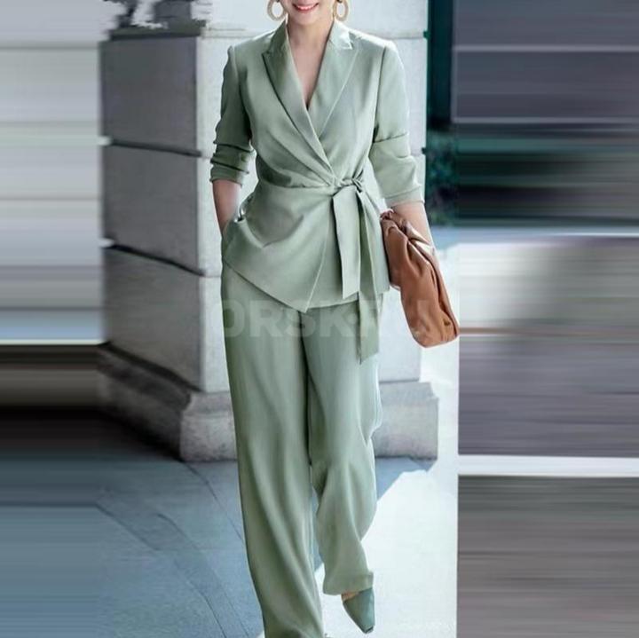 Женский брючный костюм салатного цвета, размер L, брюки на резинке.