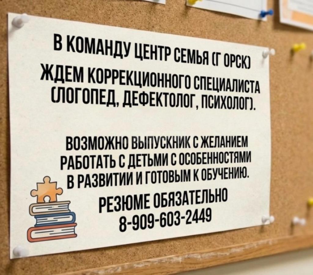 В центр Семья (филиал г Орск) ждём логопеда, дефектолога, психолога.