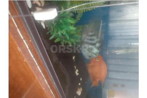Аквариум на 150 литров. С рыбками три пурпурных попугаев и один оранжевый попугай девочка, сомики
