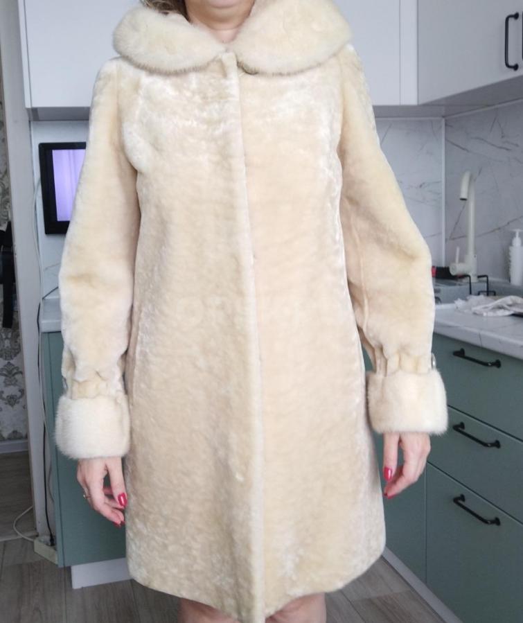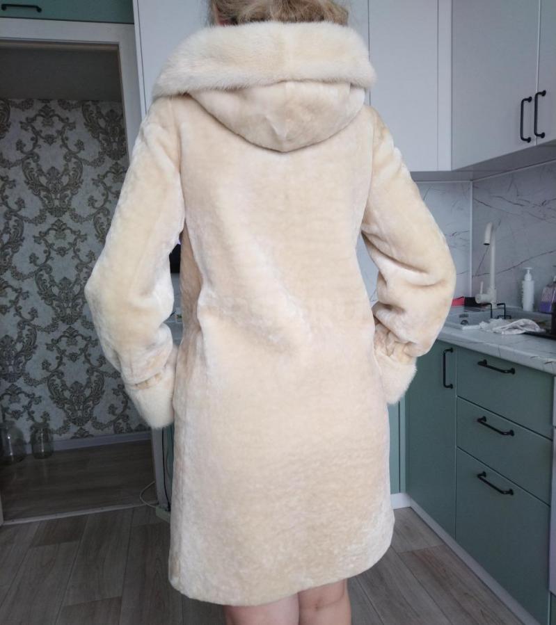 Мутоновую шубу с норкой в идеальном состоянии. Б/у один сезон, нет следов носки, размер 46