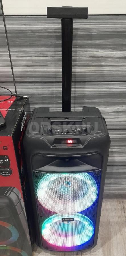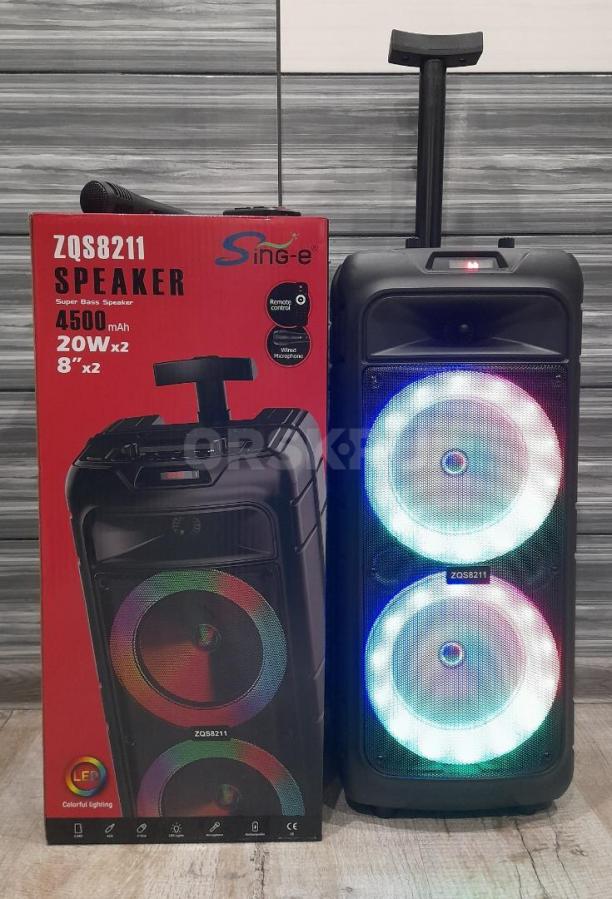 В комплекте идут кабель для зарядки, пульт управления, микрофон. Сверху есть удобная выдвижная ручка для переноски, а внизу колесики. Углубление для установки смартфона.Портативная акустическая колонка с LED подсветкой и дисплеем, встроенным MP3-плеером, FM-тюнером и эквалайзером.