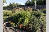 Плодоносящий сад и огород: грядки с ягодами, кустарники: малина, смородина, крыжовник, абрикос, две емкости для полива.