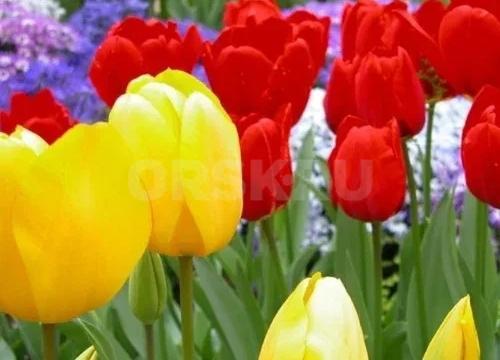 Красные и жёлтые цветы садовыех тюльпанов в районе станции Орск «Ключ», ТЗБ, 6й мкр, самая близкая остановка...